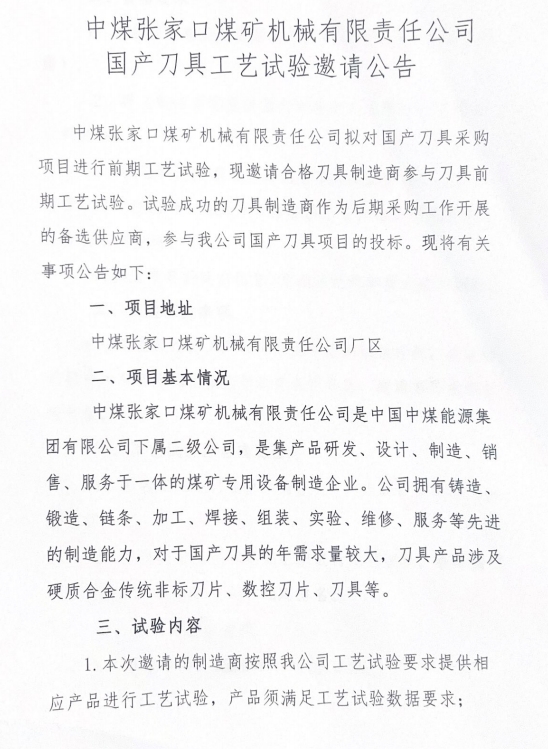 中煤張家口煤礦機(jī)械有限責(zé)任公司國(guó)產(chǎn)刀具工藝試驗(yàn)邀請(qǐng)公告