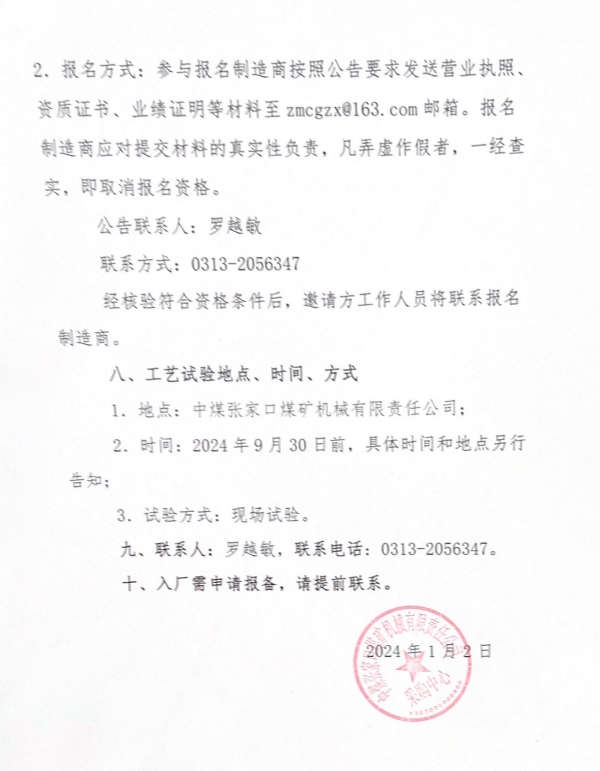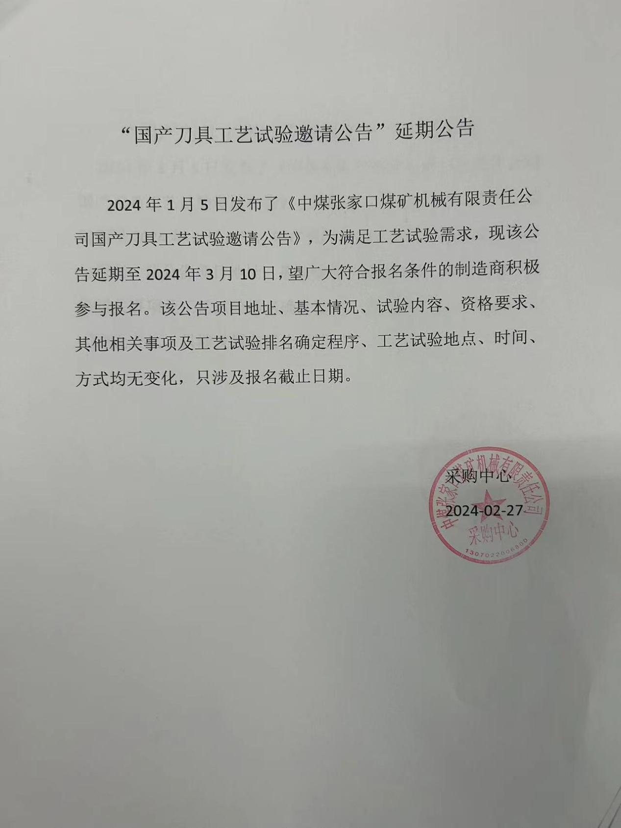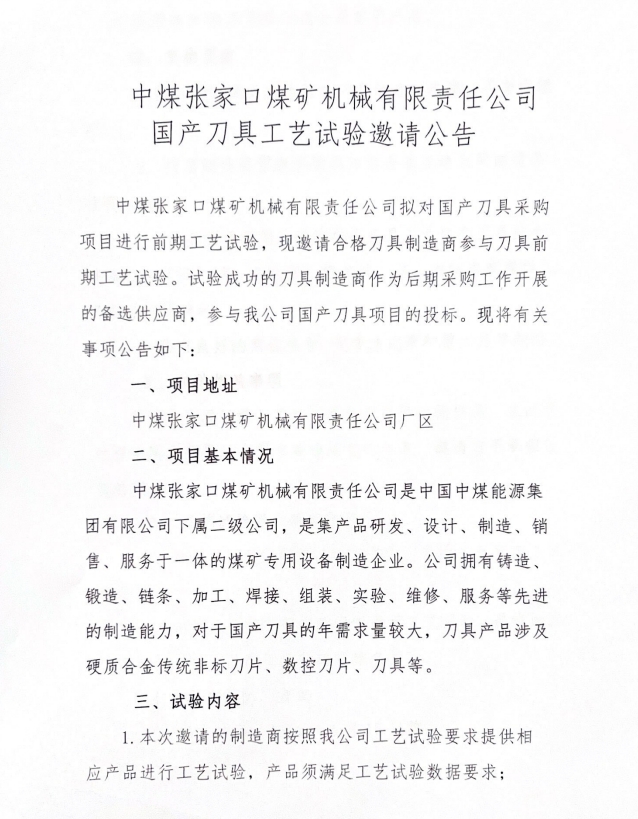 中國中煤張家口煤礦機(jī)械有限責(zé)任公司“國產(chǎn)刀具工藝試驗邀請公告”延期公告